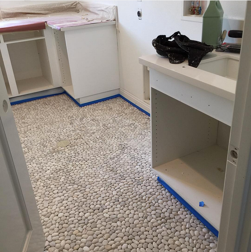Using white river rocks in the laundry room for the flooring with white Quartz counters and white shaker cabinet doors. The grout in between the rocks will be bright white and almost level with top of the rocks. Lastly there will be 2 1/2 in thick white shelves that will be mounted on the walls so they look like they are floating. Loving the way this space is going to look.