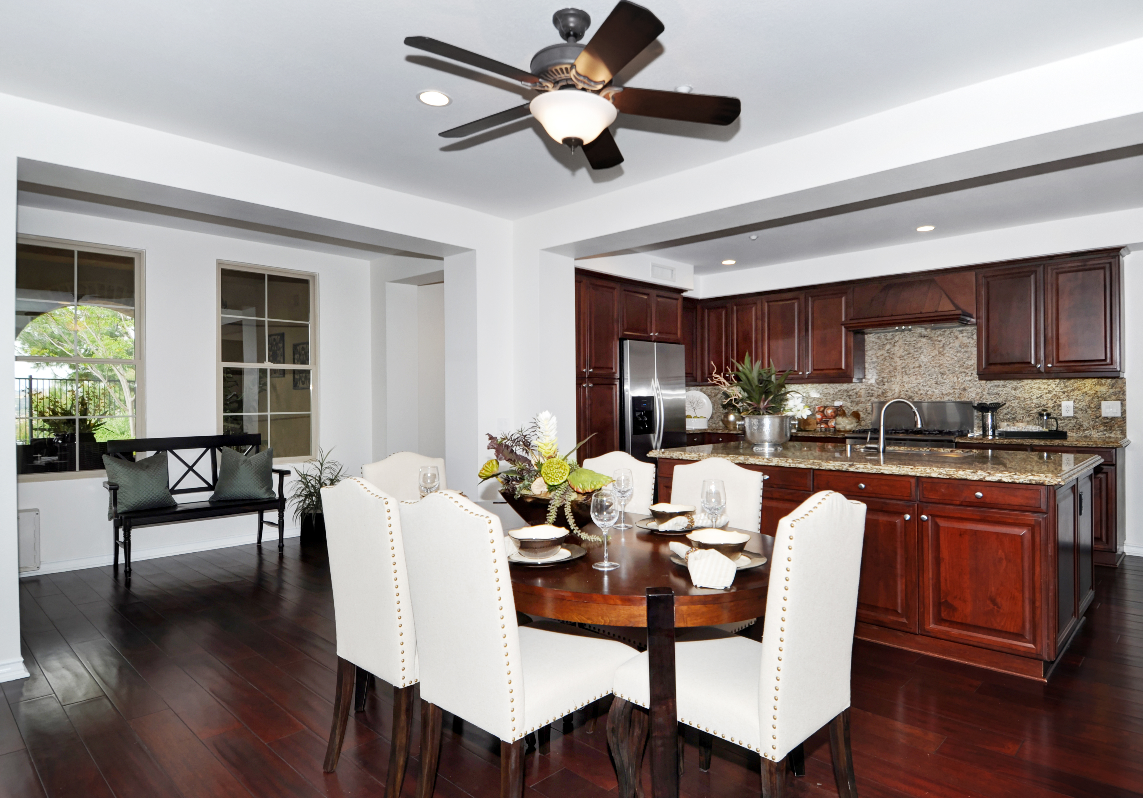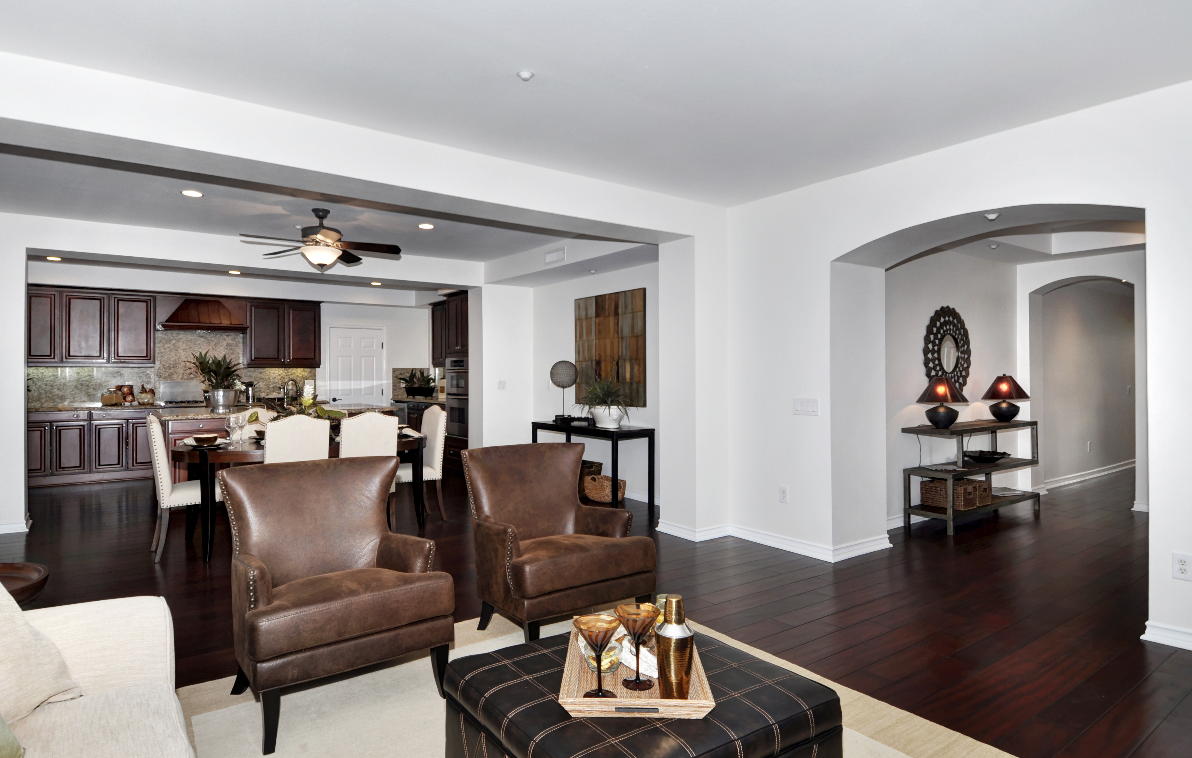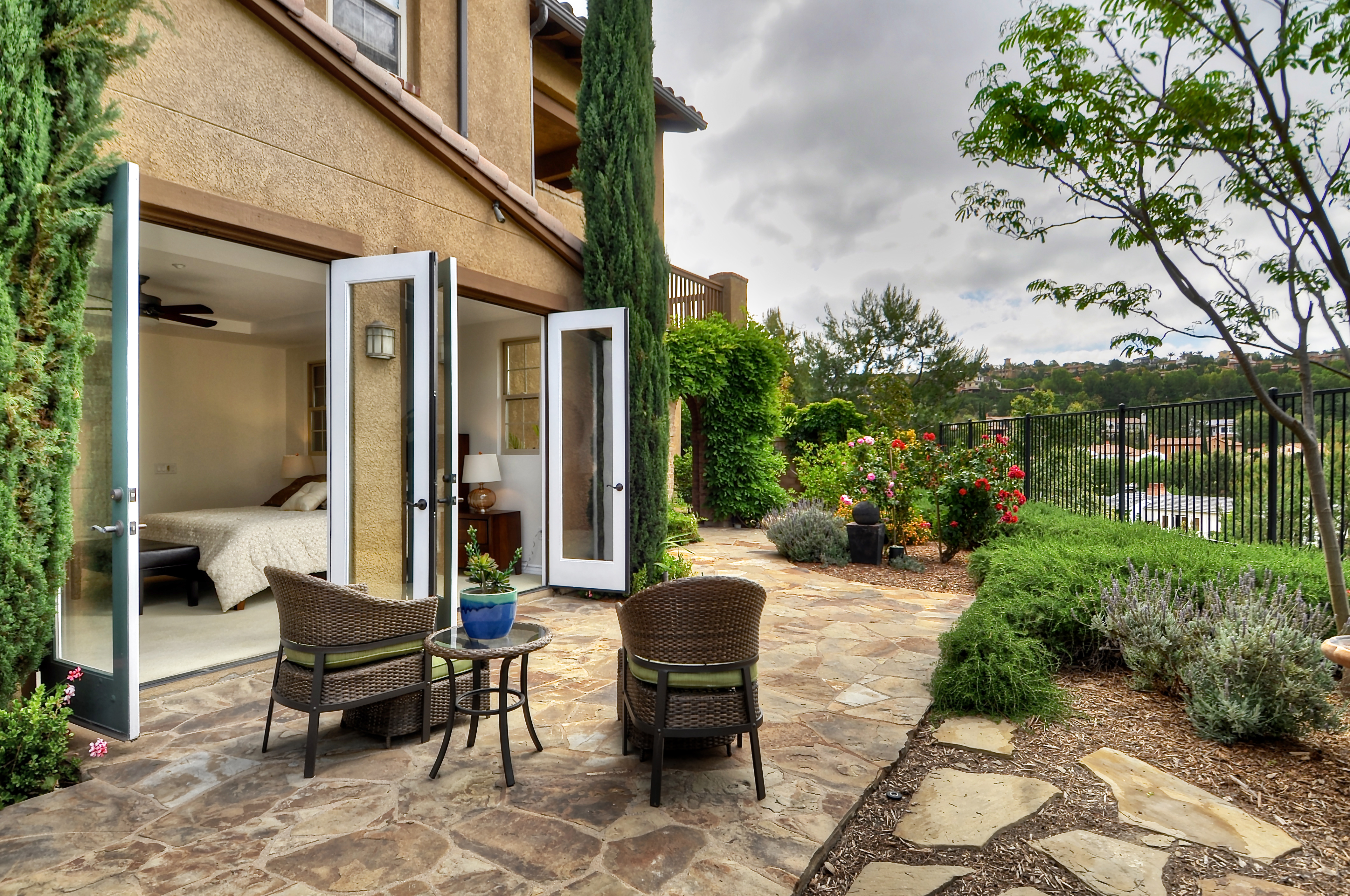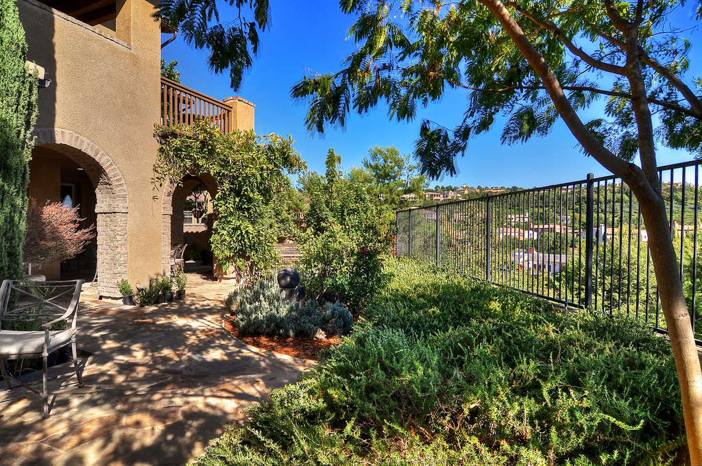 Nestled in the private guard gated, luxury community of Covenant Hills, this exclusive property offers the feel and privacy of a single family home as one of eighty two units in Castellina, the only condos in Covenant Hills, a beautiful, park-like community of multi-million dollar homes. The home provides handicap accessibility as it is a single story with no stairs, and hardwood floors throughout. This property is on one of the few premium view lots offered by the builder, and is located on an end unit on a quiet street. There is a beautiful stone fireplace in the living room and an abundance of windows that radiate natural light. The kitchen provides an entertainer and cooks dream accouterments, offering granite countertops and backsplash, merlot maple cabinets, and stainless steel appliances. Providing picturesque views, the backyard is secluded and serene, featuring numerous fruit trees and a flagstone patio, perfect for parties or for enjoying the summer breeze from the canyon during intimate dinners outside. The master suite features a walk in closet, recessed lighting, and two sets of french doors leading to the backyard. The home provides an impressive backdrop to Covenant Hills amenities including five distinctive village clubhouses that feature private pools, gardens, water play parks, tennis courts, barbecue and picnic areas, skate park and lovely large dog park.
