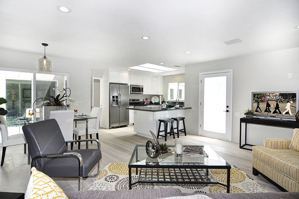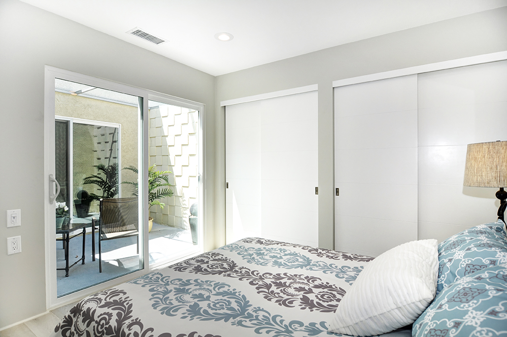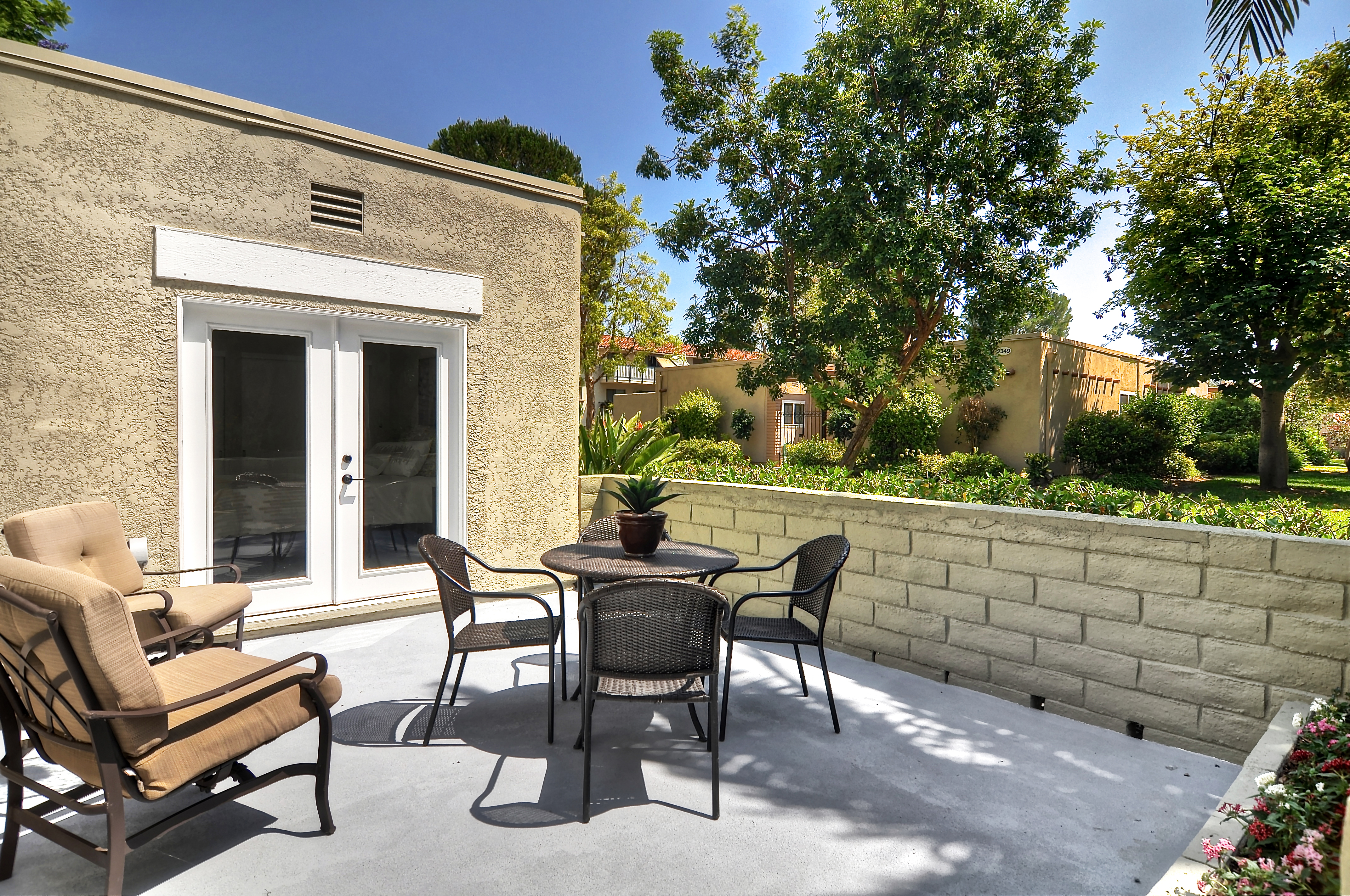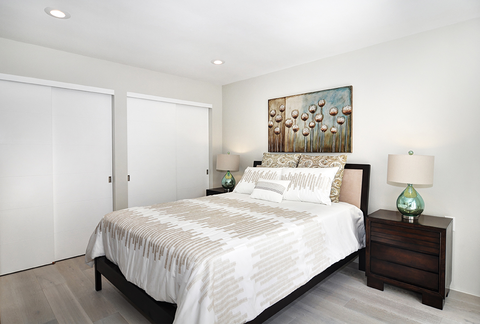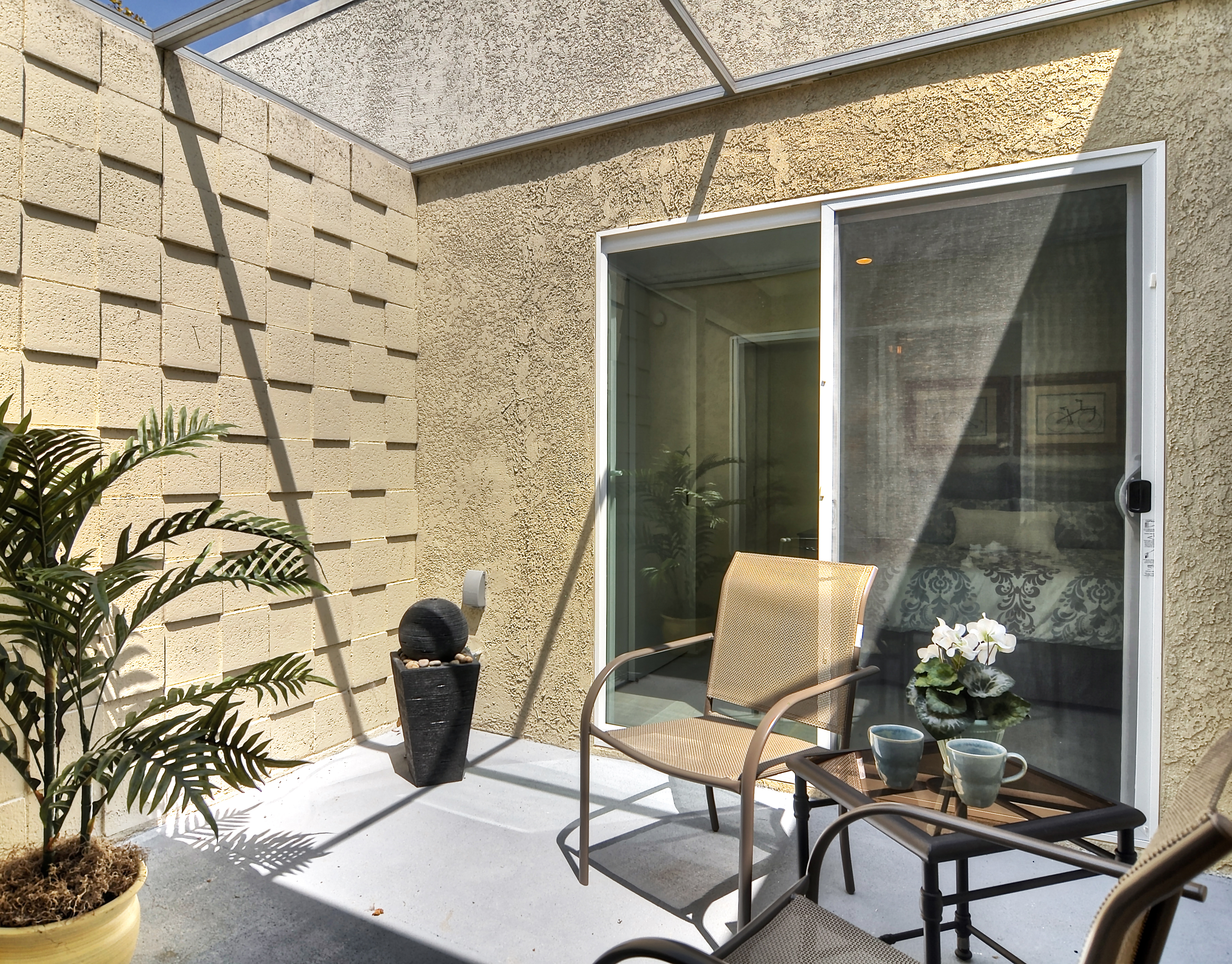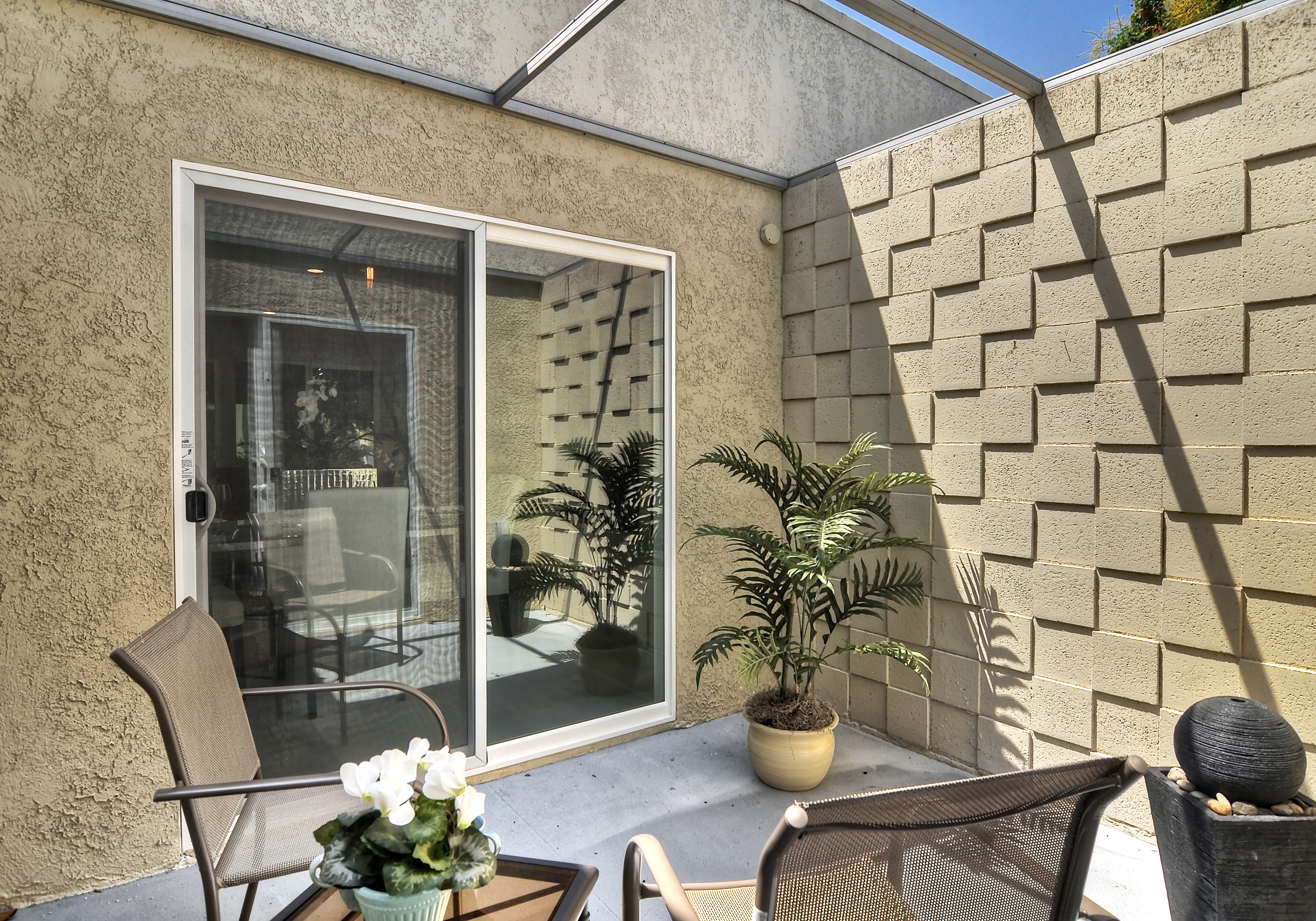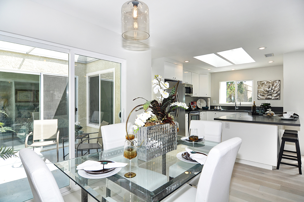 Exuding sophistication with its extensive high end remodel, location, and features, this home is located on the ground floor, which is a very coveted feature in this community, giving you the solitude of not having a neighbor above or below. The property is nestled against a greenbelt with no busy parking or street noise. Every inch of this contemporary home is brand new and beautifully designed with gorgeous hardwood flooring throughout, new paint, new electrical, fully remodeled bathrooms, central heating and air, new dual paned windows, and kitchen, featuring custom cabinets, new stainless steel appliances, and spacious island. A skylight has been added to the kitchen area for extra sunshine and peaceful ambiance. Brand new french doors offer a peaceful outdoor retreat to the private enclosed patio, and a serene sunroom or atrium offers and additional space for solitude, dining, or relaxing and enjoying the fresh air. The property sits on a South facing lot, receiving morning sun and afternoon shade, making this home an exquisite place to call home.