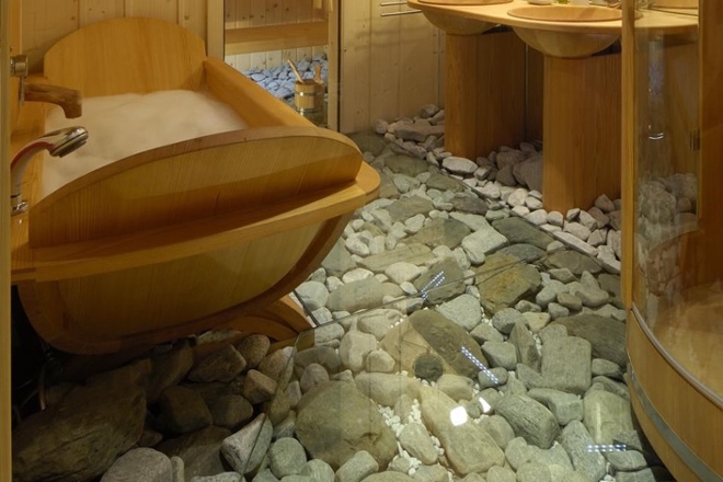 This luxury chalet’s spa bathroom features a stunning combination of stone and woodwork complete with a sauna.