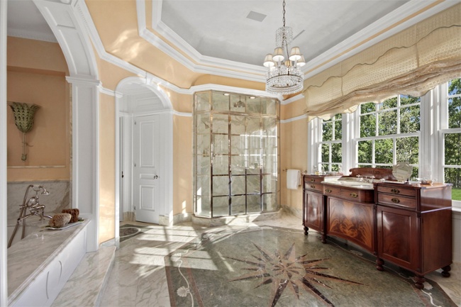 This grand Georgian-style estate sits on 86 acres overlooking a lake in one of Westchester County’s most beautiful enclaves. Designed by architect Boris Baranovich with six bedrooms and numerous formal rooms for entertaining, this home also has wonderful recreational amenities including a gym, a pool, a tennis court, and hiking trails as well as an elegant marble master bath to refresh after a challenging workout. The marble floors are inlaid with a sunburst pattern, and architectural details like crown moldings and large windows give this roomy retreat an extra dose of glamour.