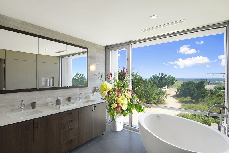 Floor-to-ceiling windows grace this luxury bathroom, providing light and stunning ocean views.