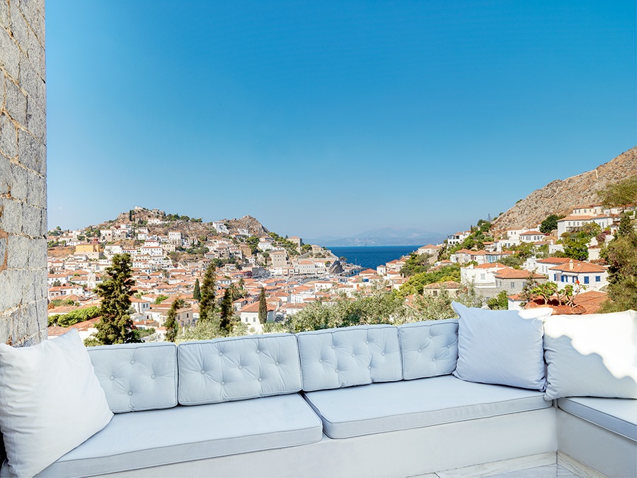The patios and terraces at this centuries-old villa in Hydra, Greece, have been designed with great care so as to blend the old with the new.