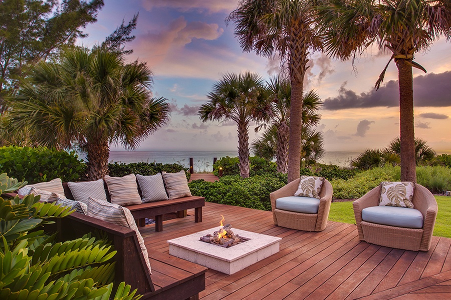 Fire elements provide warmth and enhance the ambiance of the outdoor living room of this luxury home in Nokomis, Florida.