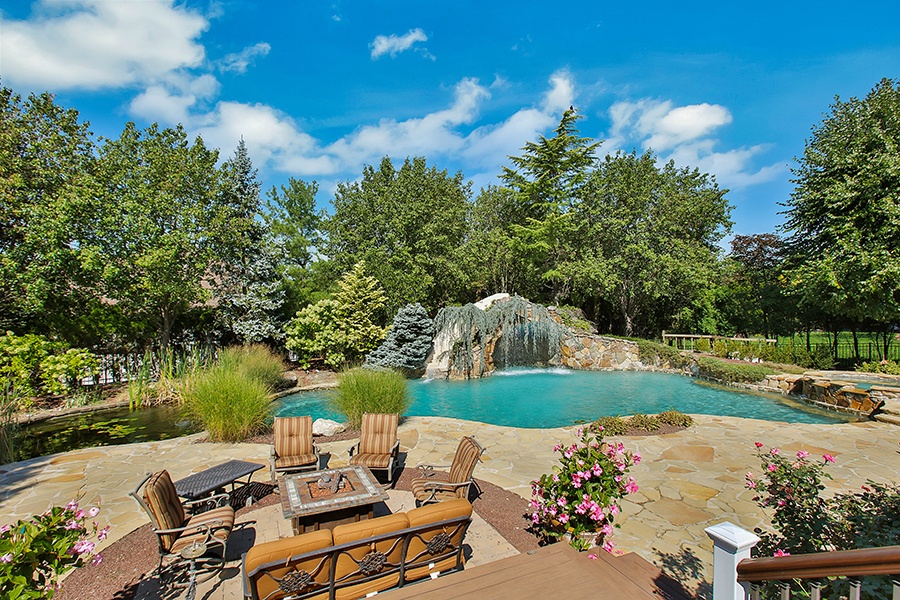 Featuring a cascading waterfall, natural rock work, and landscaping evocative of a forest, this stunning pool at an estate in Holmdel, New Jersey, characterizes the natural-pool trend.