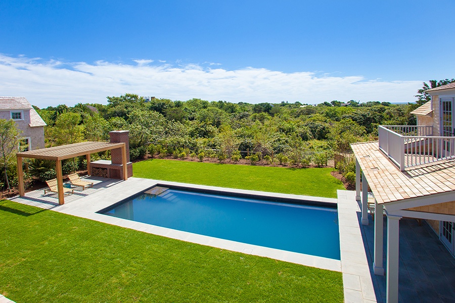 This deluxe poolside cabana creates the sense of a true private oasis on the grounds of a summer retreat in Nantucket, Massachusetts.